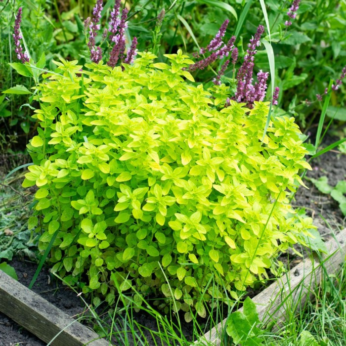 Орегано золотисте має всі властивості та аромат звичайного орегано, але при цьому має високо декоративний вигляд. Формує подушкоподібні кочки, добре реагує на стрижку, зберігає золотисте забарвлення весь сезон. Цвіте як і звичайне орегано у липні. Стрижка на початку сезону допоможе сформувати більш привабливий густий кущик. Широко використовується в ландшафтному дизайні. Яскраво виглядає у поєднанні з контрасними темними або навпаки, світлими рослинами, у гравійному садку, на камінні.